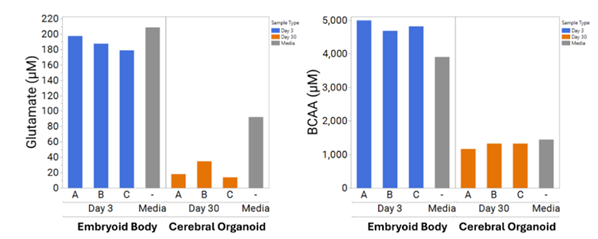 上图.3D脑类器官谷氨酸与支链氨基酸(BCAA)水平的测定:使用Glutamate-Glo™和BCAA-Glo™检测试剂盒,分别在第3天(拟胚体阶段)和第30天(大脑类器官阶段)对个体3D脑类器官(A、B、C)培养液中的谷氨酸和支链氨基酸浓度进行检测。追踪这些代谢物在神经分化过程中的变化,有助于研究人员评估神经元成熟度、突触功能以及与大脑发育相关的代谢适应。