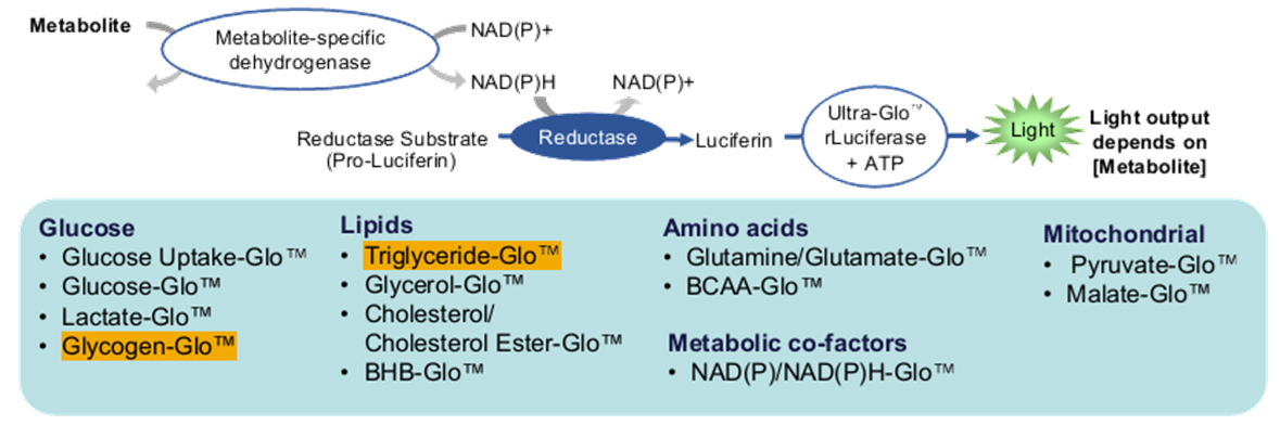 Promega提供基于多孔板的生物发光法细胞代谢检测方法,通过偶联的酶反应产生反光信号,反光信号与样品中特异的待测标记物浓度成正比。操作简单、灵敏度高,适用于高通量检测,一般可以拓展到384-1536孔板。可用于糖代谢、脂代谢、氨基酸代谢、核苷酸与辅因子、氧化应激和线粒体功能等检测,助力代谢研究及药物发现。