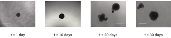 上图. 脑类器官30天发育过程的时序图像。类器官最初形成小型球状结构(第1天),随后逐渐扩大体积(第10天)。至第20天,类器官呈现萌芽状复杂形态结构;到第30天时,它们显示出进一步生长和增加的结构异质性。放大倍数:4X。