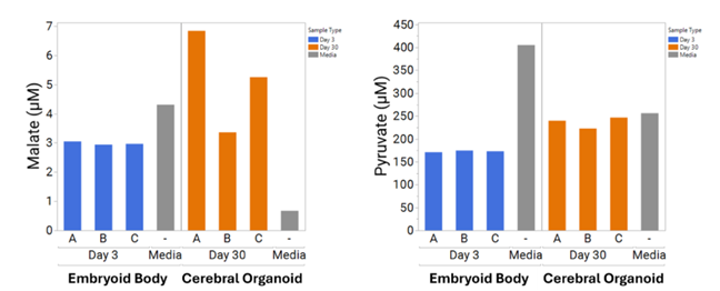 上图. 3D脑类器官丙酮酸与苹果酸水平的测定:使用Pyruvate-Glo™和Malate-Glo™检测试剂盒,分别在第3天(拟胚体阶段)和第30天(大脑类器官阶段)对个体3D脑类器官(A、B、C)培养液中的丙酮酸和苹果酸浓度进行检测。该结果展示此类检测技术如何随时间推移监测苹果酸和丙酮酸水平,从而评估三羧酸循环动态变化,为3D模型代谢监测提供了非破坏性方法。