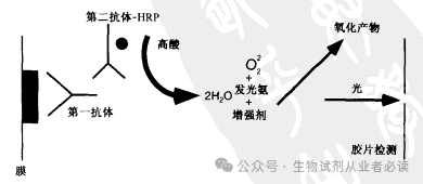 Western 印迹的 ECl,检测法是化学发光测定法的一个例子,它利用辣根过氧化物酶催化产生光,转移到膜上后,该膜与一级抗体温育,不结合的抗体被洗掉。