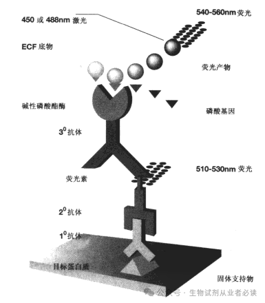 化学荧光测定的一个例子是ECF Western印迹试剂盒(Amersham)利用荧光标记的抗鼠或抗免二抗来识别一抗。二抗可以通过荧光扫描或荧光成像设备,被记录,信号放大是必需的,通过实用抗荧光素的碱性磷酸酶连接的三抗和ECF试剂可以实现。碱性磷酸从化学荧光底物水解下磷酸基团,产生一个高荧光的产物,产物吸收450nm光,发射540~560 nm的光。