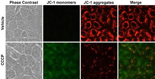 ▲图3 JC-1染色共聚焦拍照(来源:Cayman JC-1染色试剂盒说明书;货号1009172)