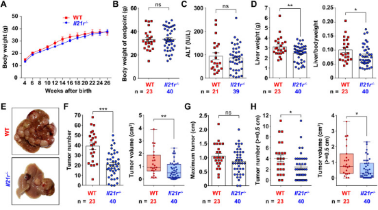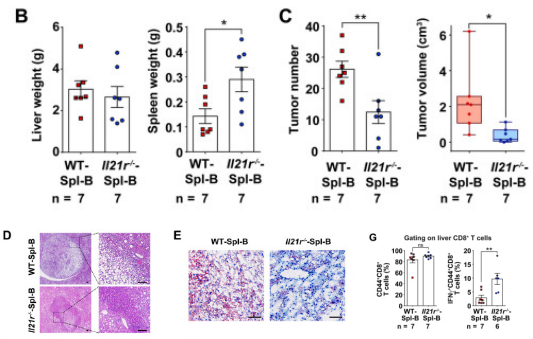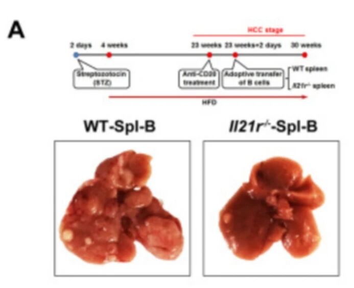 1. 过继转移实验:将Il21r−/−或WT小鼠的B细胞转移至B细胞耗竭的HCC小鼠。