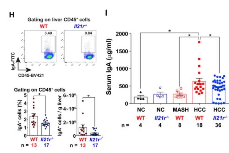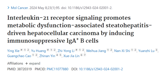 代谢功能障碍相关的脂肪性肝炎(MASH)是肝细胞癌(HCC)的重要驱动因素,但其向HCC转变的免疫调控机制尚不明确。既往研究表明,MASH驱动的HCC发展与肿瘤微环境中免疫细胞(如巨噬细胞、CD8+ T细胞、调节性T细胞等)的功能失调密切相关,尤其是免疫抑制性IgA+ B细胞通过抑制细胞毒性CD8+ T细胞(CTL)的活性促进肿瘤进展,然而IgA+ B细胞的具体诱导机制仍未阐明。IL-21/IL-21R信号通路在炎症和癌症中具有双重作用,但其在MASH相关HCC中的功能及机制有待深入探究。
