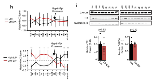 2. LbNOX不影响Akt磷酸化、FoxO1靶基因、DAGs或ceramides水平,代谢流分析提示GAPDH可能是NADH敏感的控制点。