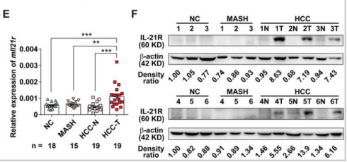 3.使用qRT-PCR和Western blot检测小鼠MASH-HCC模型中IL-21R的mRNA和蛋白水平,在小鼠MASH-HCC模型中,IL-21R在肿瘤组织中显著上调。