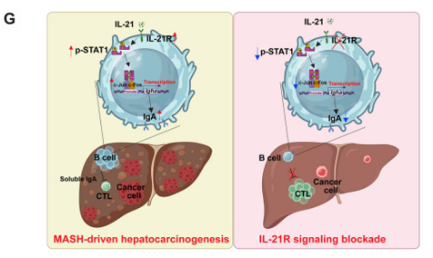 3. IL-21R ↑ → p-STAT1 ↑ → c-Jun/c-Fos激活 → 结合Igha启动子 → IgA⁺ B细胞 ↑ → 抑制CD8⁺ T细胞 → 促进MASH-HCC发生。