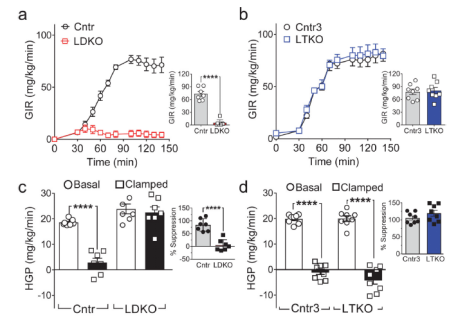 1. 建立遗传模型:LDKO:肝脏特异性敲除 Irs1 和 Irs2;LTKO:LDKO + 肝脏特异性敲除 FoxO1;FDKO:脂肪组织特异性敲除 Irs1 和 Irs2;LIRKO:肝脏特异性敲除胰岛素受体。LDKO 小鼠出现 WAT 胰岛素信号减弱和 HGP 不受抑制,而 LTKO 小鼠恢复正常。