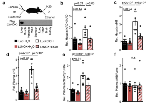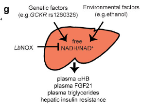 NADH/NAD⁺比值的重要性:NADH和NAD⁺是细胞代谢中的核心辅因子,尤其在肝脏中调控糖脂代谢。但其在疾病中的因果作用尚不明确。目前现状缺乏能特异性地、在亚细胞水平操纵NADH/NAD⁺比值的工具。现有方法(如补充NR)往往全身性作用,无法区分组织或亚细胞特异性效应。αHB已被发现与胰岛素抵抗、糖尿病风险和线粒体疾病相关,但其生物学机制未知。GCKR 基因的常见变异与超过130种代谢性状相关,但其下游机制不明。因此本研究的目的是使用新型遗传工具LbNOX直接调控肝脏细胞质NADH/NAD⁺比值,探究其对代谢性状的因果影响,并阐明αHB和GCKR变异的作用机制。