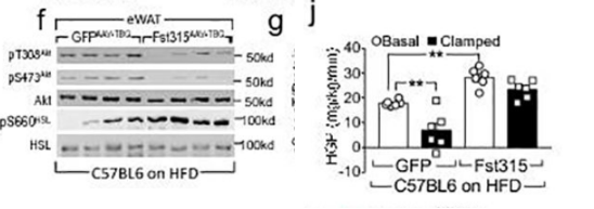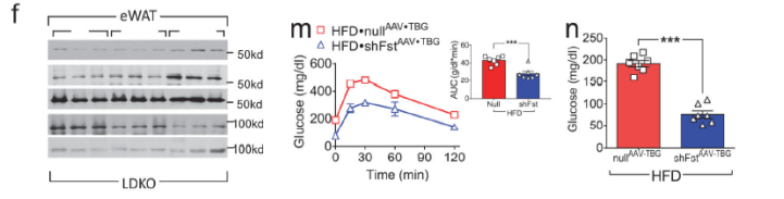 在 LDKO 或 HFD 小鼠中敲低肝脏 Fst,可恢复 WAT 胰岛素敏感性、改善葡萄糖耐量和 HGP 抑制。