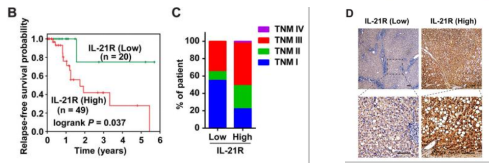 2.分析IL-21R表达与临床病理特征(TNM分期、脂肪变性程度、无复发生存期)的关系,IL-21R高表达与更差的無复发生存期、更晚的TNM分期和更严重的脂肪变性相关。