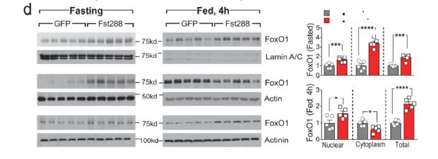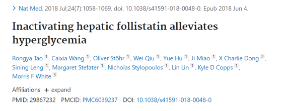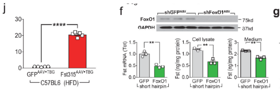 2. 筛选出 Fst 是 FoxO1 调控的关键肝因子,过表达 Fst315 可导致胰岛素抵抗,FoxO1 直接结合 Fst 启动子,调控其表达;糖尿病患者术后 FST 下降与 HbA1c 改善相关。