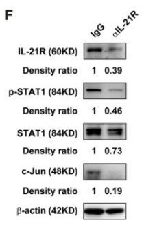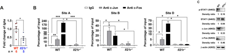 4. Western blot和ChIP assay检测IL-21R下游信号通路,证实IL-21R通过STAT1–c-Jun/c-Fos轴促进Igha转录。