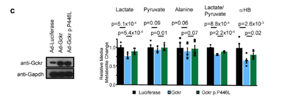 2. 过表达GKRP 446P可降低乳酸/丙酮酸和αHB,而446L变异此效应减弱