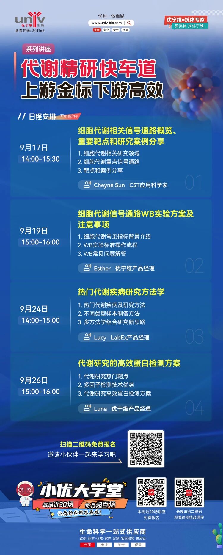 本周及下周,优宁维还为大家组办了4节线上系列讲座,围绕代谢研究的热门话题,感兴趣就快快报名参与吧~如果你错过了前面两节课,还可在下方报名二维码处观看回放~