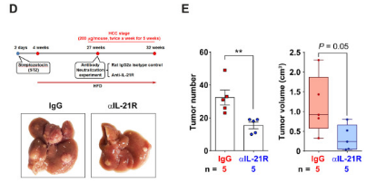1. 使用IL-21R阻断抗体(αIL-21R)处理HCC小鼠,αIL-21R处理显著抑制肿瘤生长。