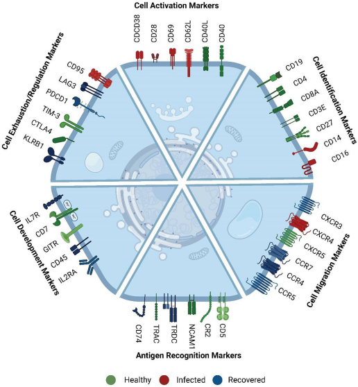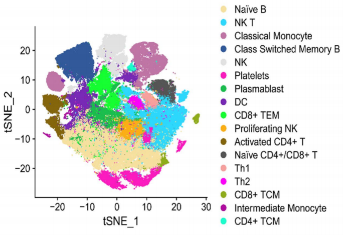 从三类样本健康、COVID-19 感染者和康复者收集到的 124,726细胞,通过T-SNE做可视化分析,分成了17个不同免疫群。