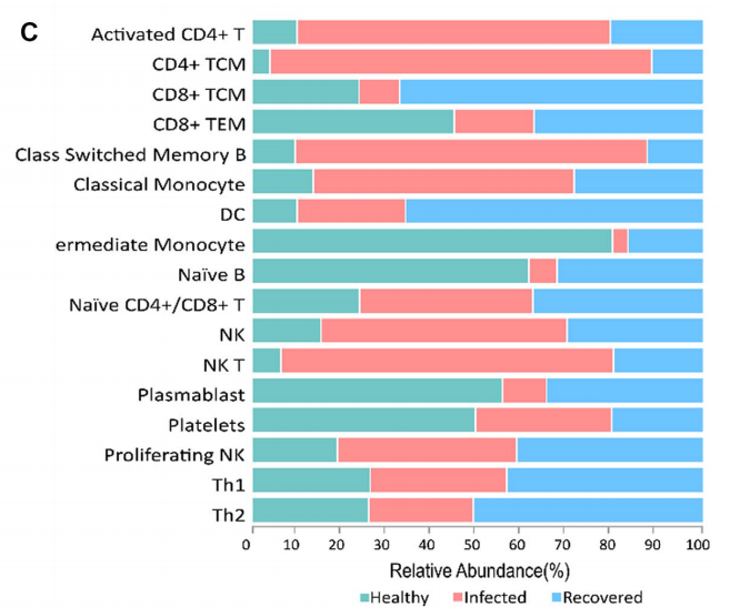 通过柱状图,将17个免疫亚群在三类不同来源样本(健康、COVID-19 感染者和康复者)做了比例说明。