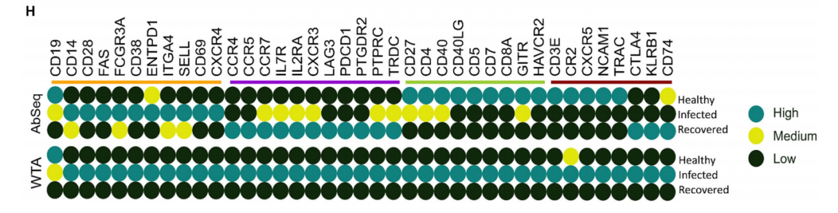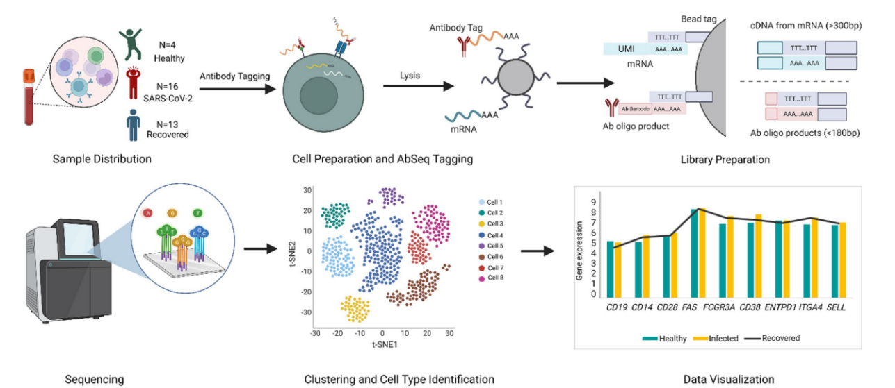 健康、SARS CoV-2感染和恢复的样本分为三组,工作流程原理图如上,然后进行WTA和AbSeq的文库制备和scRNA测序。