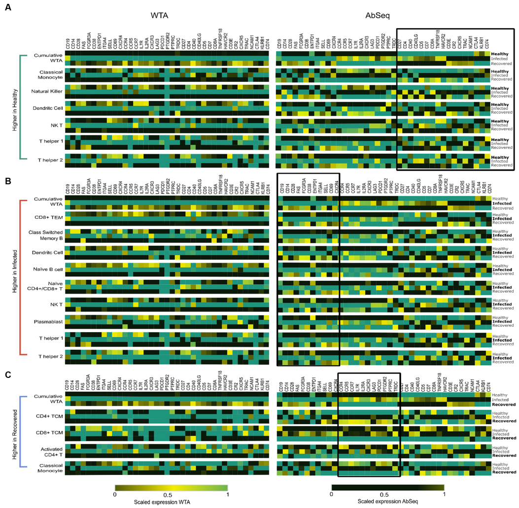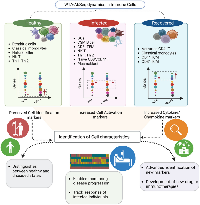 通过可视化图形展示了健康组、感染组和康复组中不同细胞类型中 WTA 和 AbSeq 之间的差异。