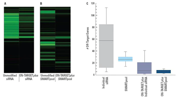 图注:ON-TARGETplus™修饰减少了脱靶效应,而SMARTpool进一步减少了脱靶的数量