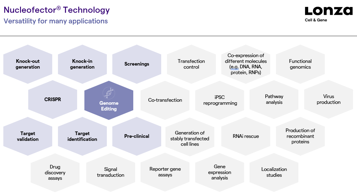 Lonza Nucleofector™核转染系统可以广泛应用于多种不同的场景,在不同的应用场景下通常会使用DNA或RNA或蛋白进行外源基因的递送,以实现特殊的应用需求。