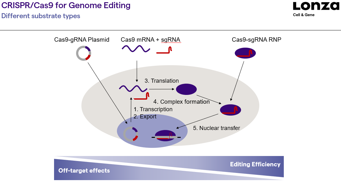 · 对于CRISPR的转染,即可以通过表达Cas9的质粒系统如PX458载体来实现“剪刀” Cas9的递送,也可以通过Cas9 mRNA的方式在细胞质中直接翻译,与sgRNA形成复合物后再进入细胞核进行基因组编辑。当然我们也可以在转染前提前将Cas9蛋白与sgRNA进行孵育形成RNP复合物,再通过电转染递送到细胞内,直接进入细胞核进行基因组编辑。